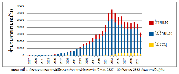 | ศูนย์เฝ้าระวังความปลอดภัยด้านผลิตภัณฑ์สุขภาพ ได้รับรายงานเหตุการณ์ไม่พึงประสงค์จากการใช้ผลิตภัณฑ์สุขภาพยาและวัตถุเสพติดในฐานข้อมูล Thai Vigibase ตั้งแต่ปี พ.ศ. 2527 และสามารถนำมาวิเคราะห์ได้รวมทั้งสิ้น 834,854 ฉบับ (ข้อมูล ณ วันที่ 17 ตุลาคม พ.ศ. 2562) (แผนภาพที่ 1) |